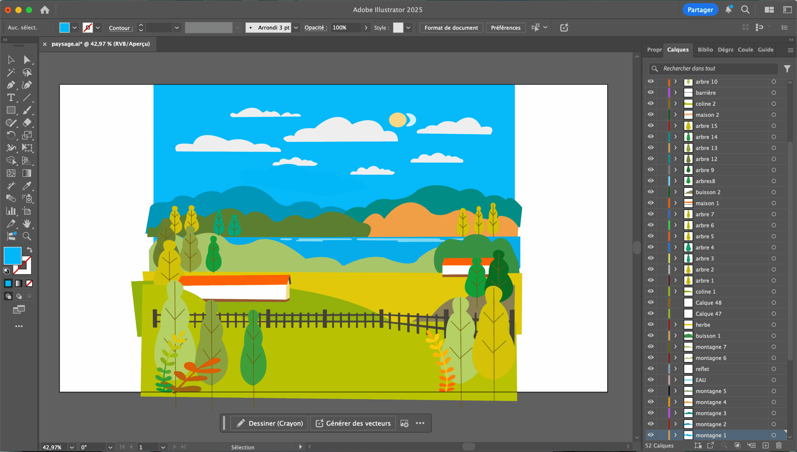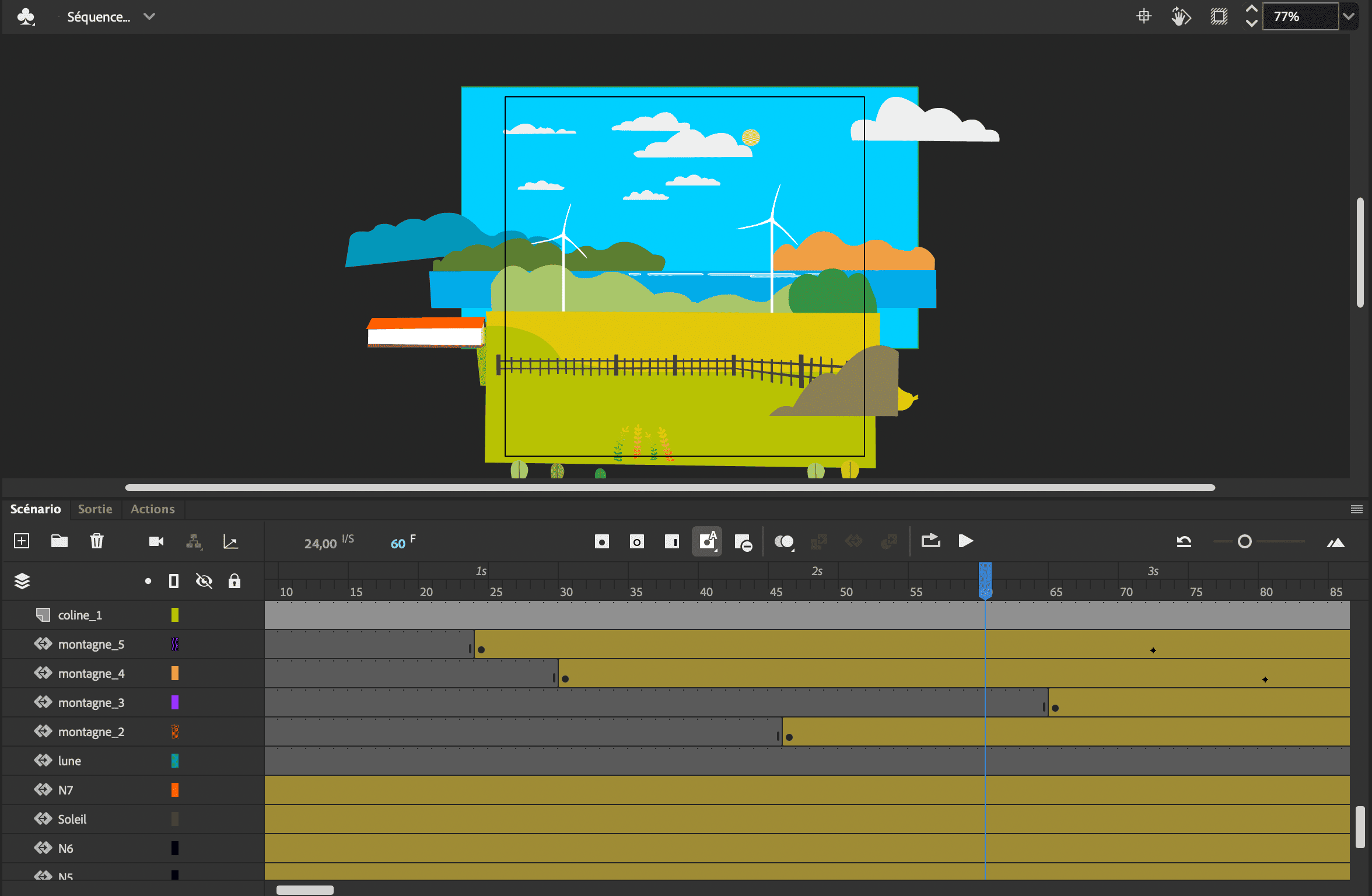 Pour ce projet, nous devions animer un paysage en appliquant les techniques apprises en cours. J’ai d’abord dessiné l’ensemble du décor sur Illustrator, en séparant chaque élément sur des calques distincts afin de faciliter l’animation. Ensuite, j’ai animé le fond et les éléments sur Animate, en ajoutant des interactions au clic grâce à JavaScript pour rendre la scène interactive.