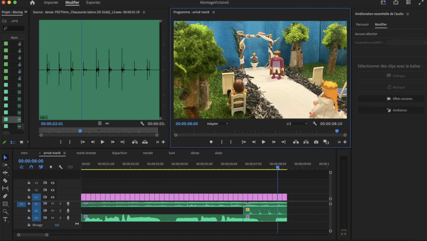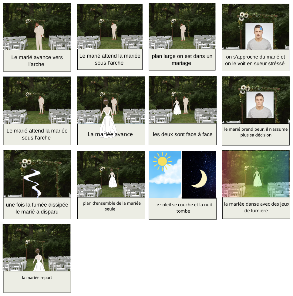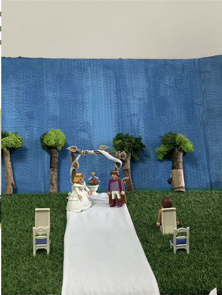 Dans ce projet de stop motion, nous avons choisi d’utiliser l’expression française « Prendre la poudre d’escampette » et l’émission « Mariés au premier regard ». Le concept du projet repose sur l’idée d’un mariage entre un homme et une femme, où, lors de l’arrivée de la mariée, le marié, trop stressé, ne parvient pas à gérer ses émotions et s’enfuit avec de la fumée, tel un magicien. Nous avons opté pour des Playmobiles comme personnages et avons conçu un décor champêtre, inspiré de scènes comme celle du mariage entre Bella et Edward dans la saga Twilight, se déroulant dans les bois. L’utilisation de la fumée pour la fuite du marié s’inspire de la série Wizards of Waverly Place, où les sorciers utilisent la fumée pour disparaître avec un coup de baguette magique.