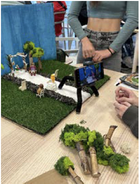 Le décor a été réalisé en groupe avec des matériaux tels que du bois, de la mousse verte, du carton et de la peinture pour recréer une atmosphère authentique et immersive. Après avoir pris les photos image par image en équipe, chaque membre a réalisé son propre montage.