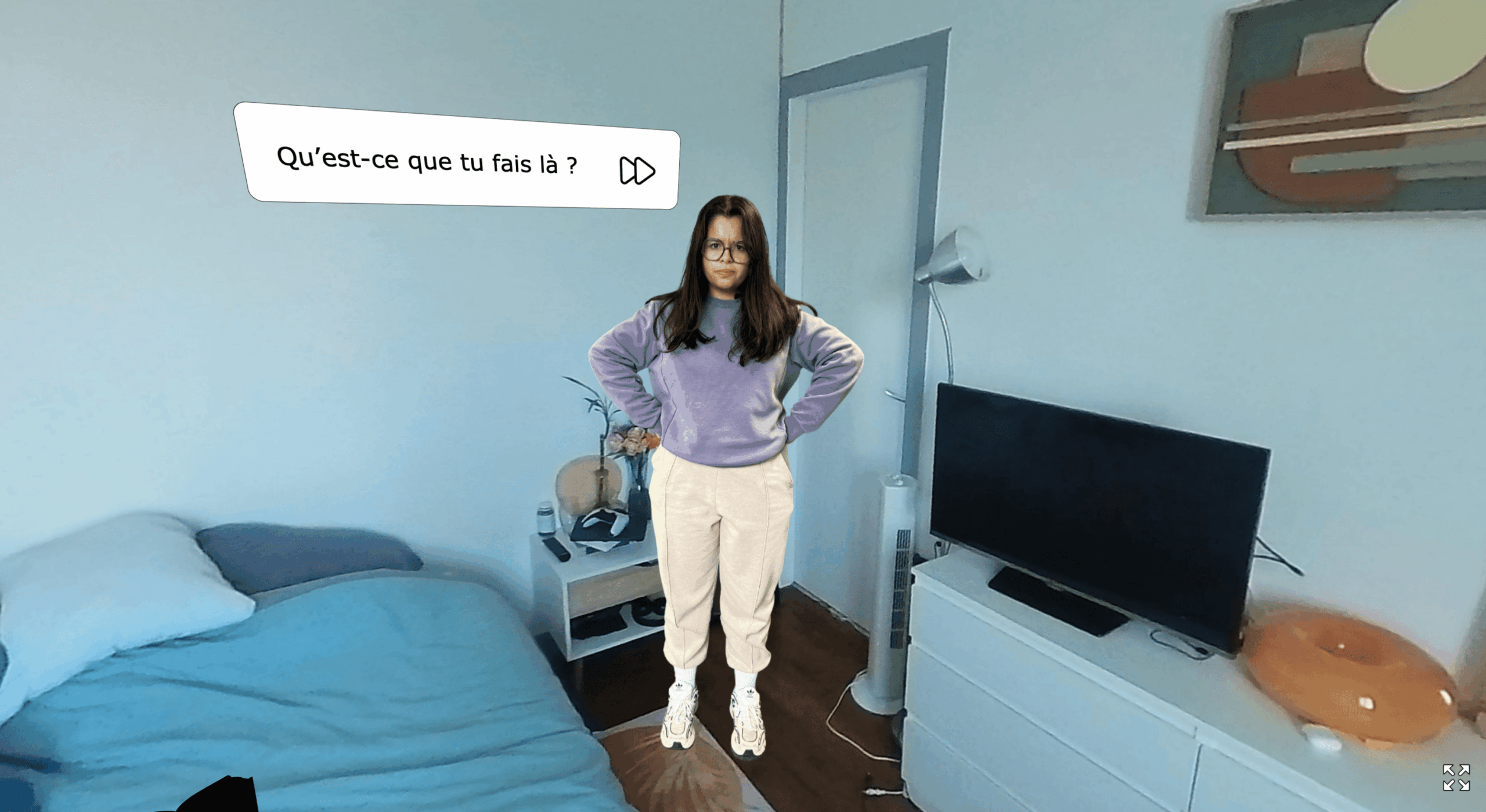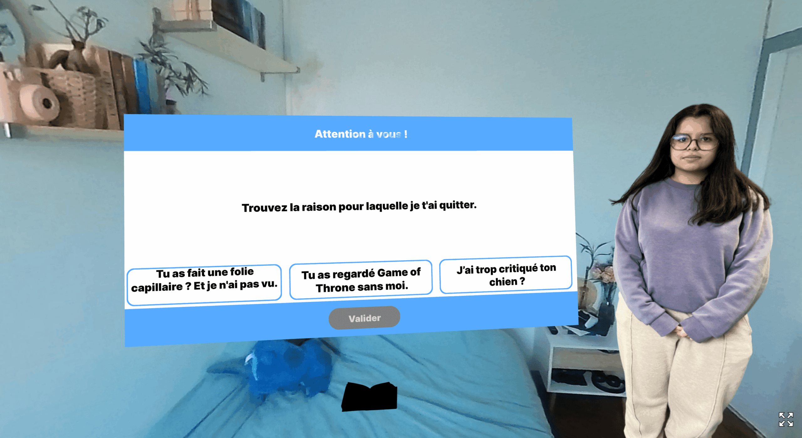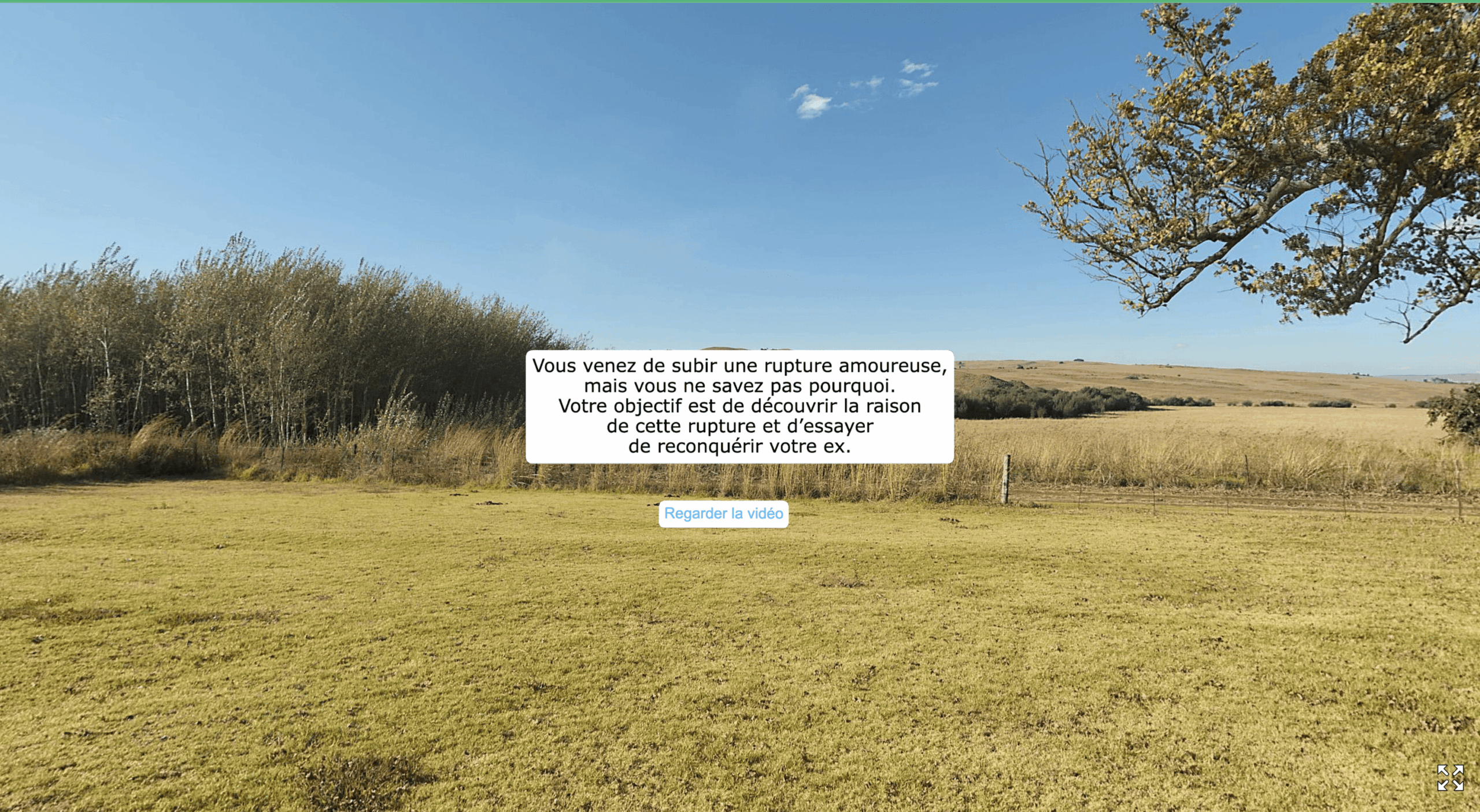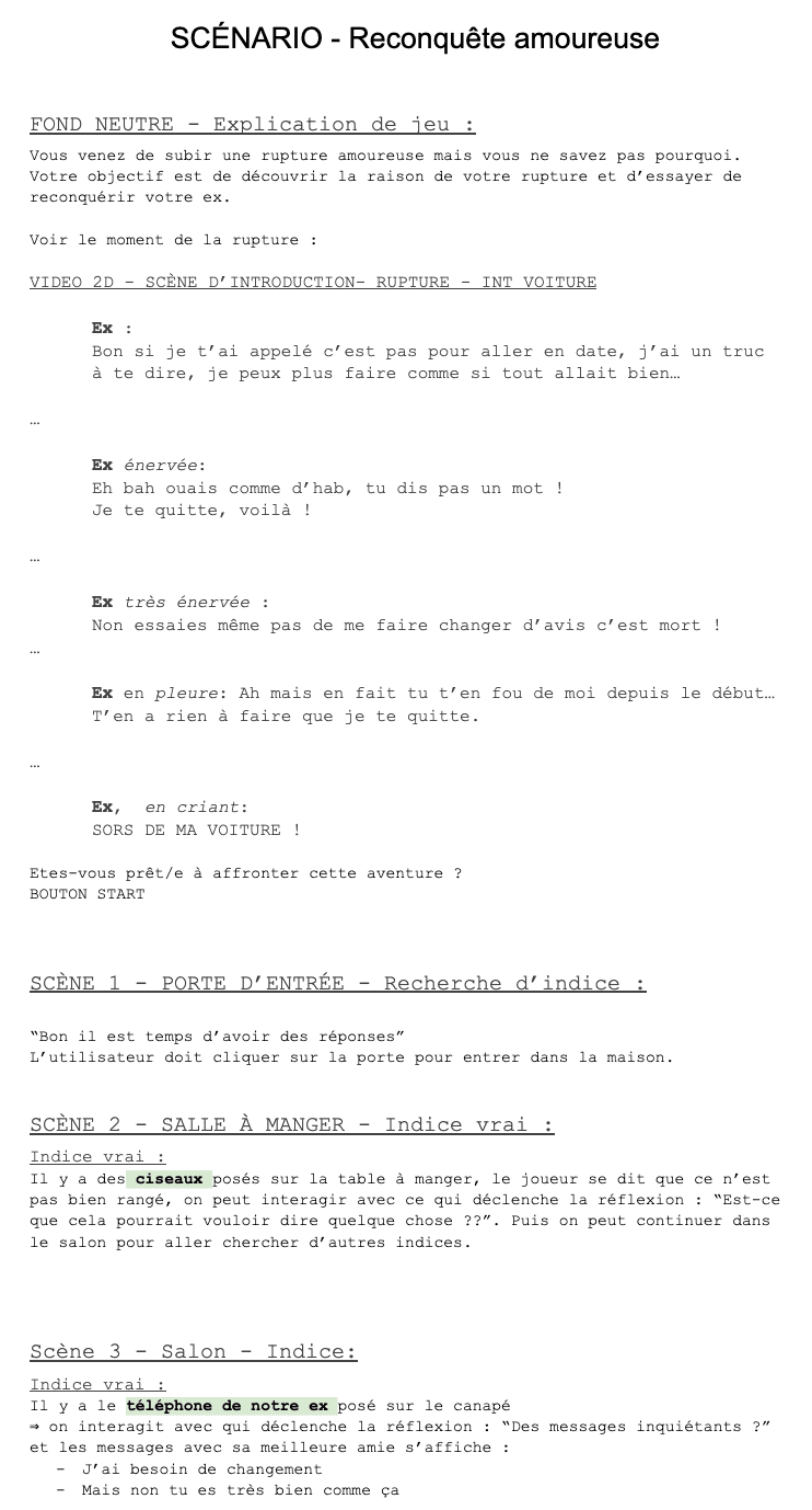 L’objectif était de développer une expérience interactive en environnement 360°. Le scénario choisi met en scène une chasse aux indices chez une ex-partenaire, le but étant de récolter des preuves pour la réconciliation.